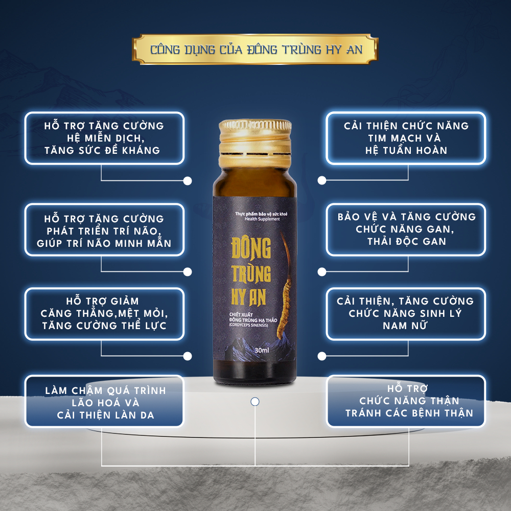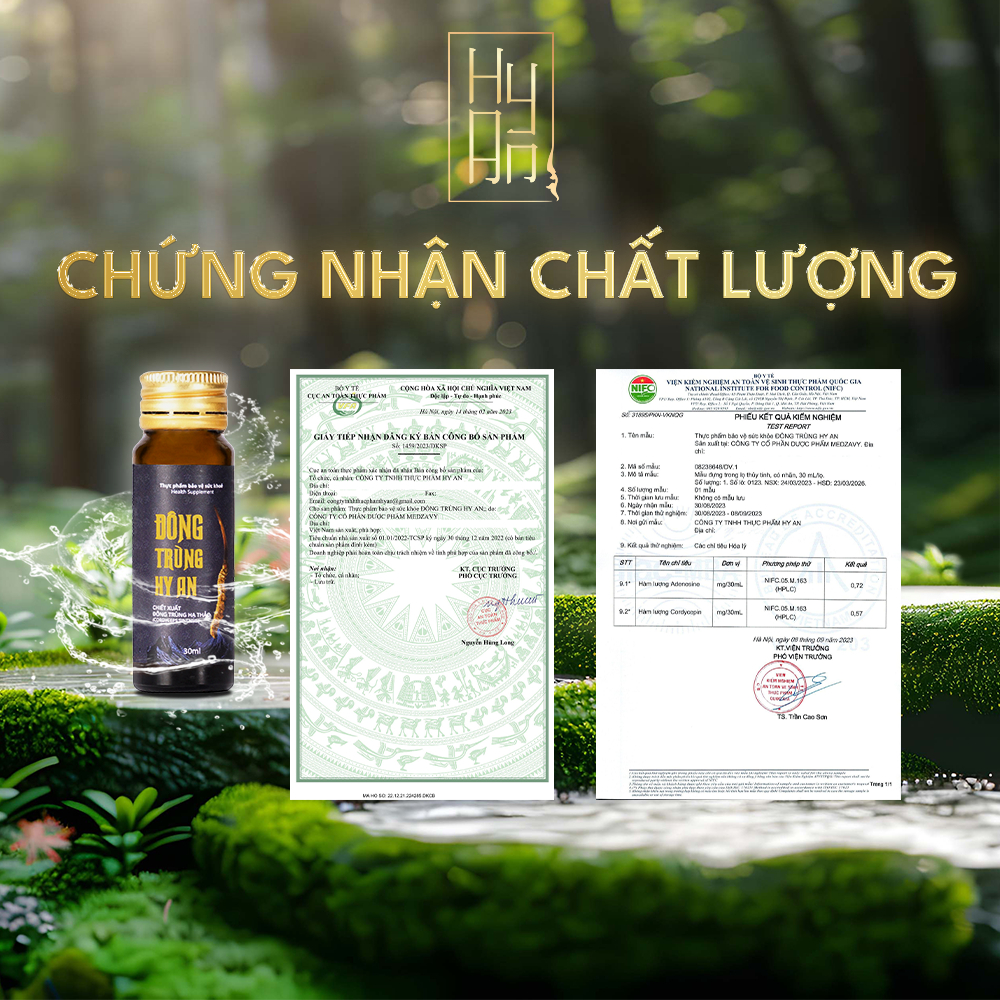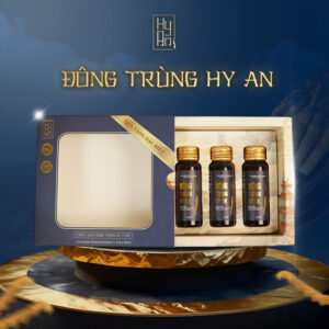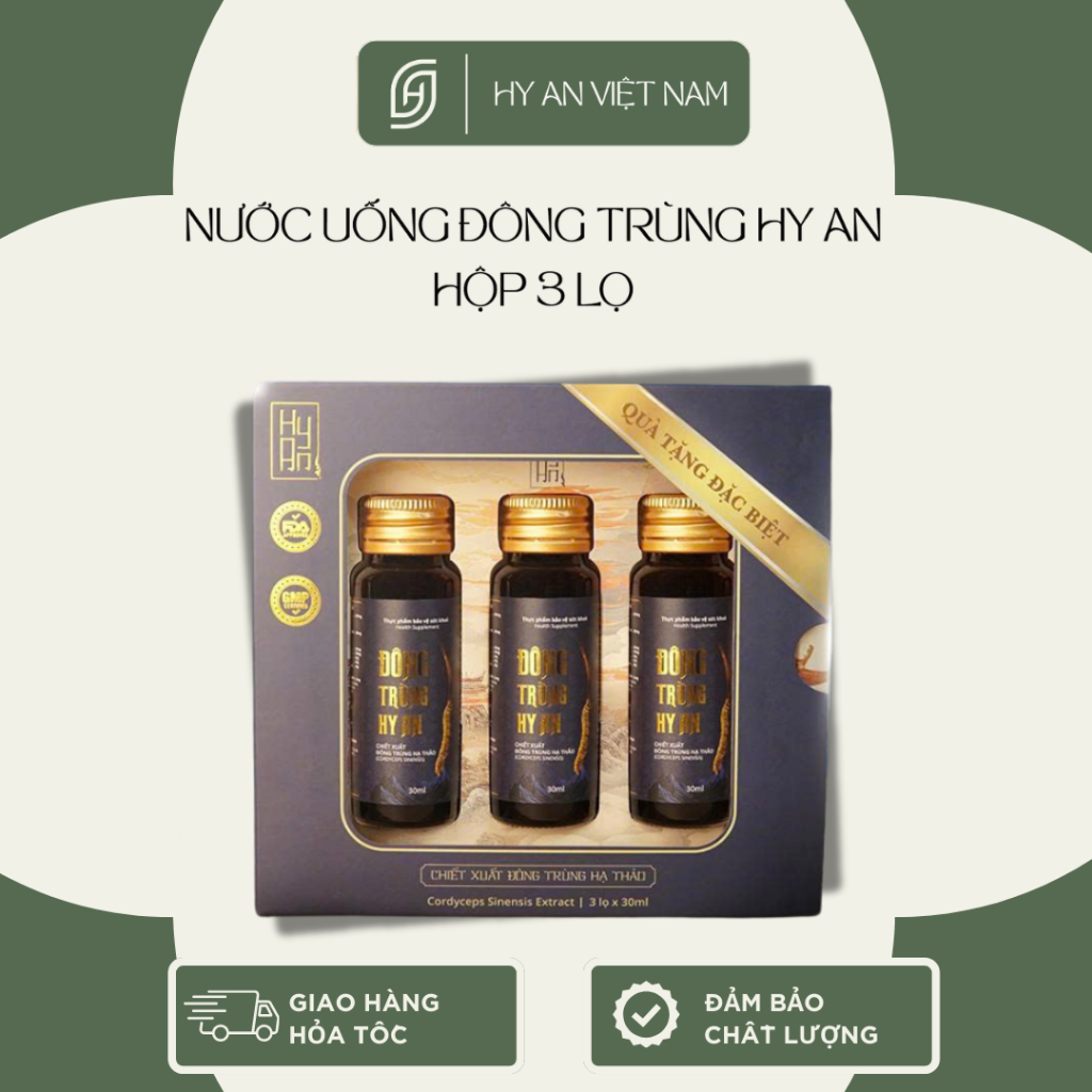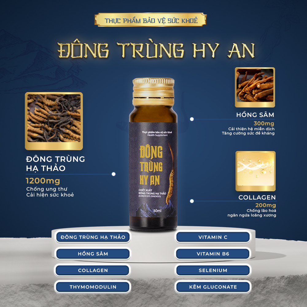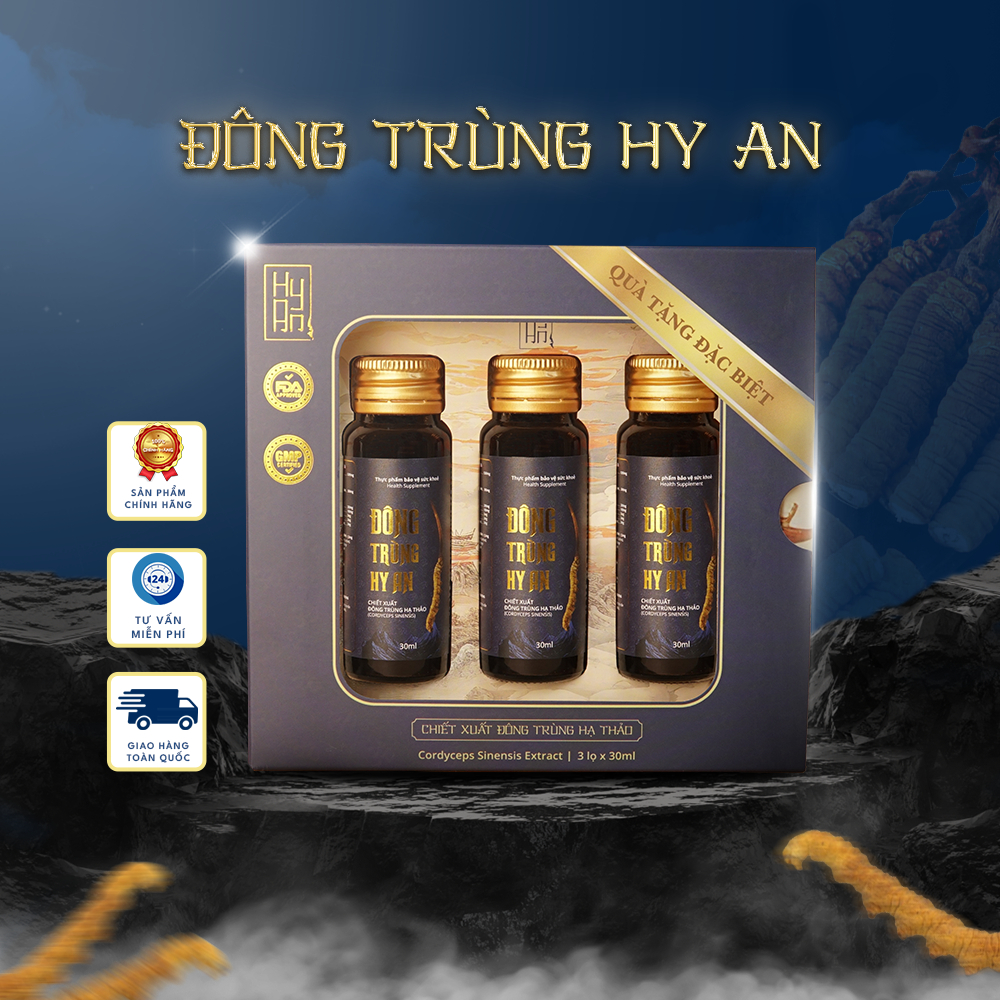 Thức uống bảo vệ sức khỏe Đông trùng hạ thảo Hy An là sản phẩm nước uống chiết xuất từ đông trùng hạ thảo tự nhiên (Cordyceps Sinensis) kết hợp với các dược liệu quý hiếm: Hồng sâm, collagen, thymomodulin, Selenium, Vitamin,... giúp nâng cao hệ miễn dịch, tăng cường sức khỏe toàn diện cho cơ thể. Sản phẩm được đăng ký công bố bởi Bộ y tế – Cục an toàn thực phẩm, theo Giấy tiếp nhận đăng ký bản công bố sản phẩm số 1459/2023/ĐKSP. Quy cách đóng gói: Hộp 3 lọ, 30ml/lọ Thời hạn sử dụng sản phẩm: 36 tháng kể từ ngày sản xuất. Lưu ý: Thực phẩm này không phải là thuốc, không có tác dụng thay thế thuốc chữa bệnh. Không sử dụng cho người mẫn cảm, kiêng kỵ với bất kì thành phần nào của sản phẩm.